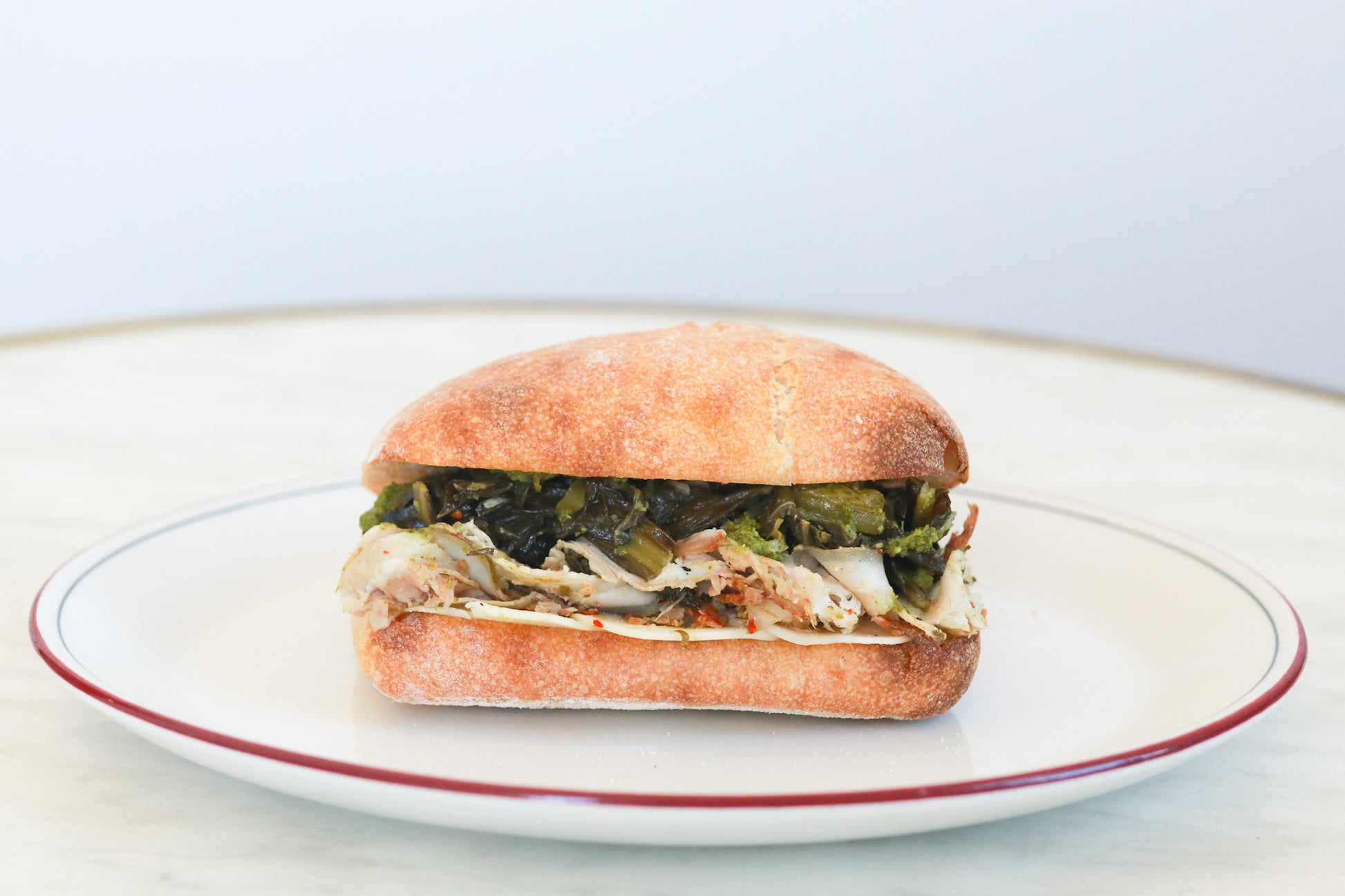 Rotisserie Porchetta, Slow Cooked Italian Greens, Salsa Verde, Provolone Cheese